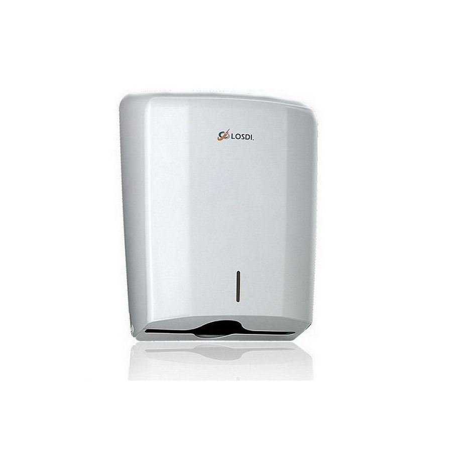 A LOSDI hajtogatott kéztörlő adagoló "C" és "V" hajtogatott kéztörlővel használható. Egyszerű fehér megjelenésével bármilyen mosdóhoz kiválóan illeszthető. Tartós ABS műanyag borítással rendelkezik, így nagyobb forgalmú helyekre is tökéletes választás.