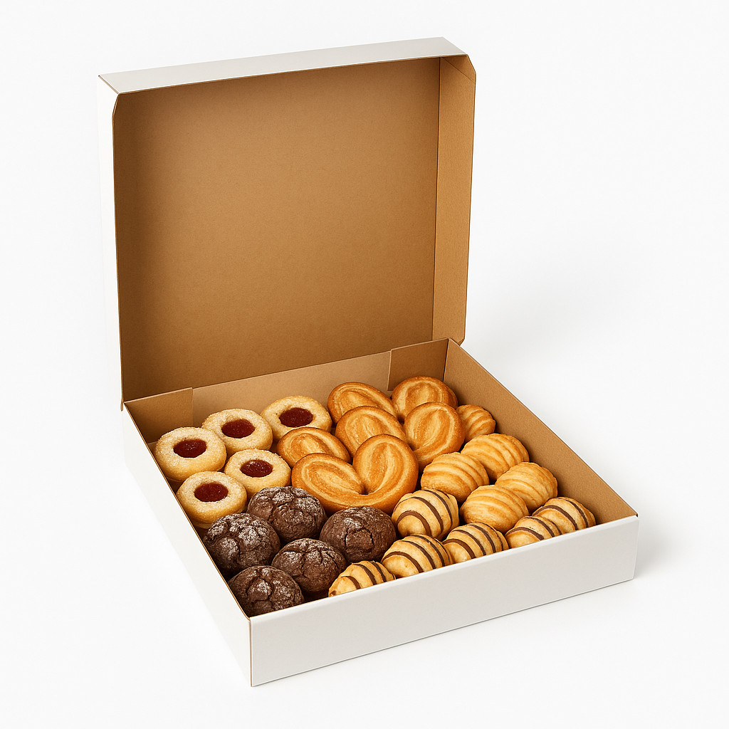 Kiváló minőségű, teasüteményes doboz, ideális sütemények, aprósütemények, kekszek, pogácsák és más péksütemények csomagolásához. Erős, hajtogatott kartonból készült, így megtartja formáját és védi a termékeket a sérülésektől. Könnyen összehajtható, praktikus megoldás cukrászdák, pékségek és vendéglátóhelyek számára.