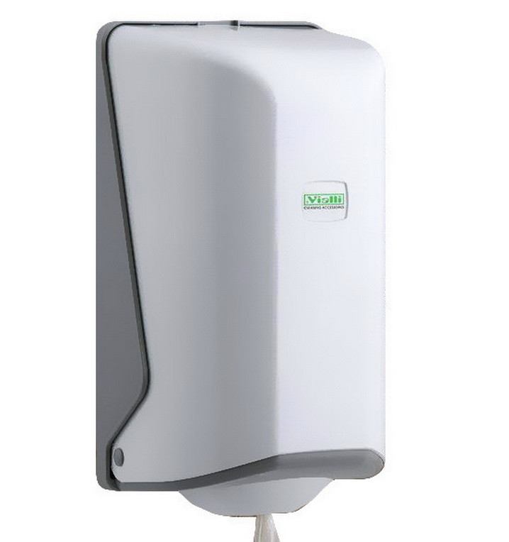 Vialli tekercses kéztörlő adagoló pont adagolással. A papírt egy szűkített nyíláson keresztül lehet kihúzni az adagolóból, ezáltal a perforáció mentén elszakad, így egyszerre csak egy lap kerül a felhasználó kezébe. 14 cm átmérőjű, perforált, belső mag adagolású tekercses kéztörlő papírral használható.