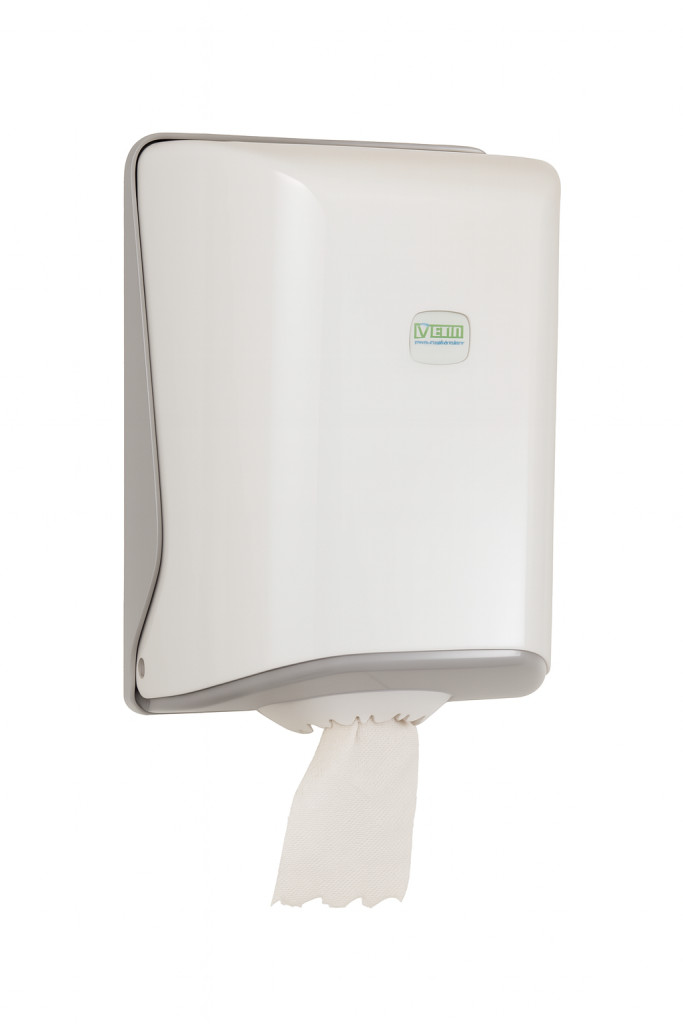 Vialli tekercses kéztörlő adagoló. 19 cm átmérőjű belső mag adagolású papír kéztörlővel használható. Az adagoló nyílása tépőfogakkal van ellátva, így perforált és perforáció nélküli papírral is használható.