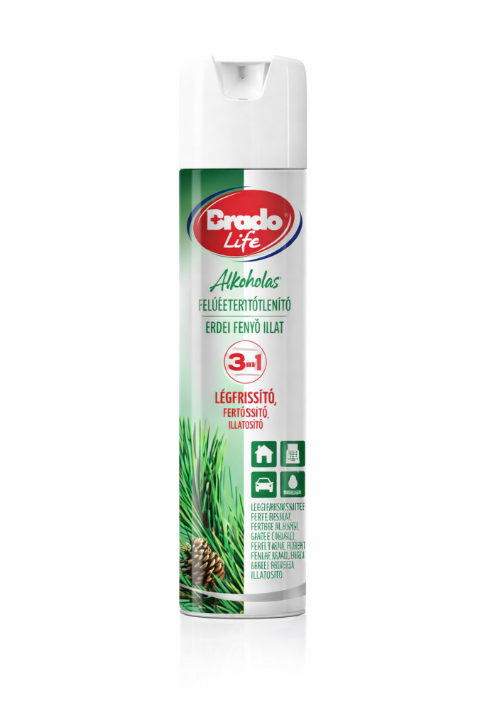A BradoLife Fenyő illatú aeroszol 3 az 1-ben megoldás: felületfertőtlenítő, légfrissítő és illatosító egyben. Alkoholos összetételének köszönhetően gyorsan hat, miközben friss, természetes fenyő illatot hagy maga után. Ideális irodákba, üzletekbe, mosdókba, közösségi terekbe és járművekbe.